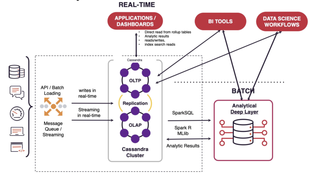 Cassandra Cluster: Serves as the central data store, supporting both OLTP (real-time read/write operations) and OLAP (analytical processing) with data replication for high availability.